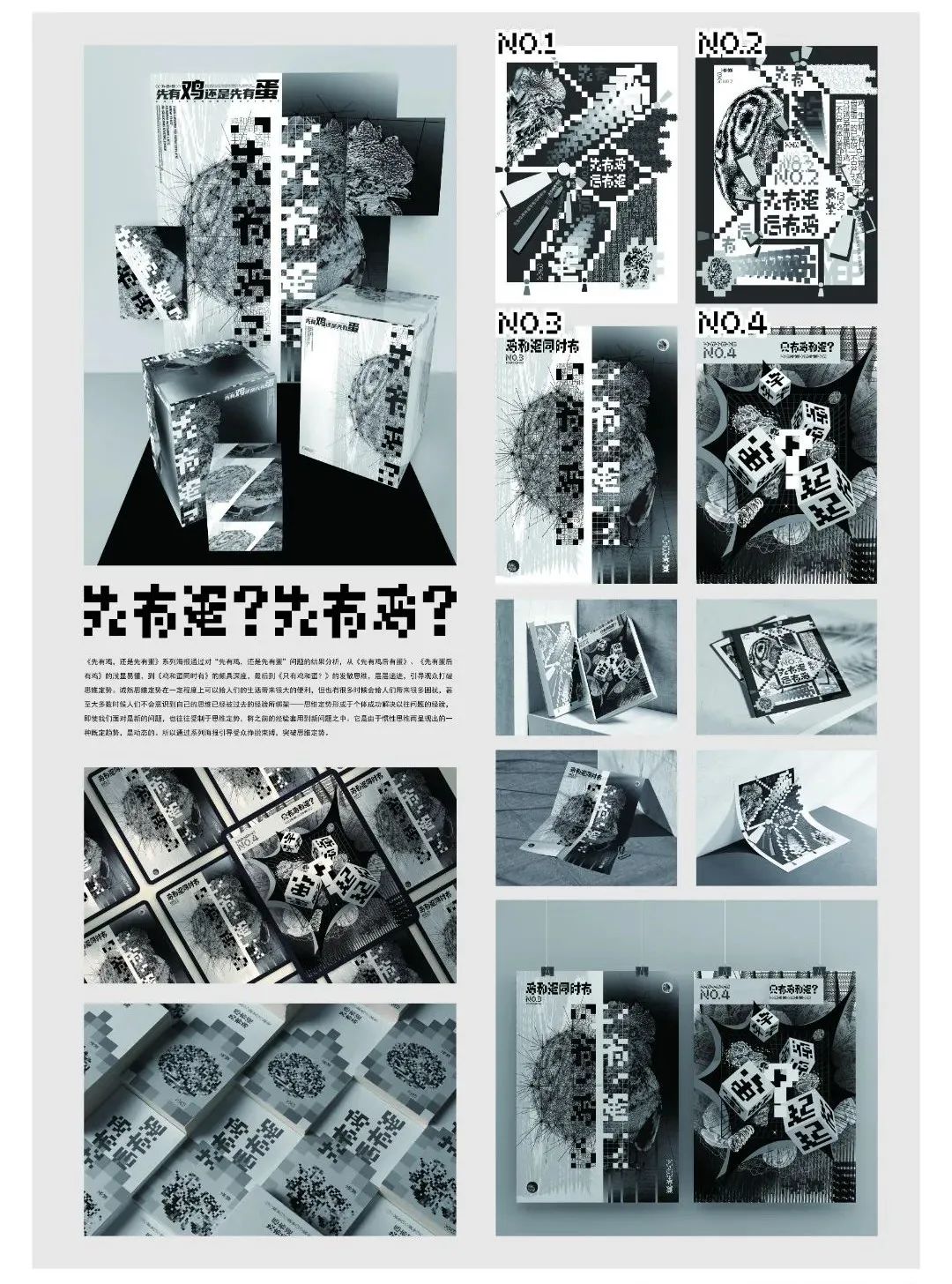 作品主要通过对“先有鸡,还是先有蛋”问题的分析,从《先有鸡后有蛋》、《先有蛋后有鸡》的浅显易懂,到《鸡和蛋同时有》的颇具深度,最后到《只有鸡和蛋?》的发散思维,层层递进,引导观众打破思维定势。思维定势很多时候会给人们带来很多困扰,甚至大多数时候人们不会意识到自己的思维已经被过去的经验所绑架。设计者希望通过系列海报来引导受众挣脱束缚,突破思维定势。