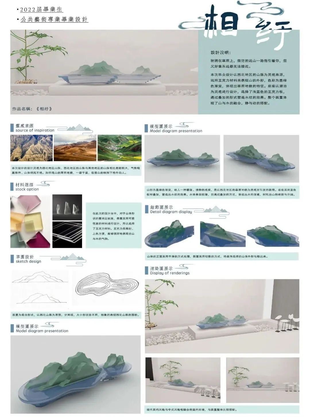 本次毕业设计以西北地区的山脉为灵感来源,运用亚克力材料来表现山的外形,色彩为墨绿色渐变,体现出草原地貌的特征。底座以湖泊为灵感进行设计,选择了浅蓝色的亚克力板,通过叠加的形式营造水纹的效果。整个装置体现了山与水的融合,静与动的搭配。
