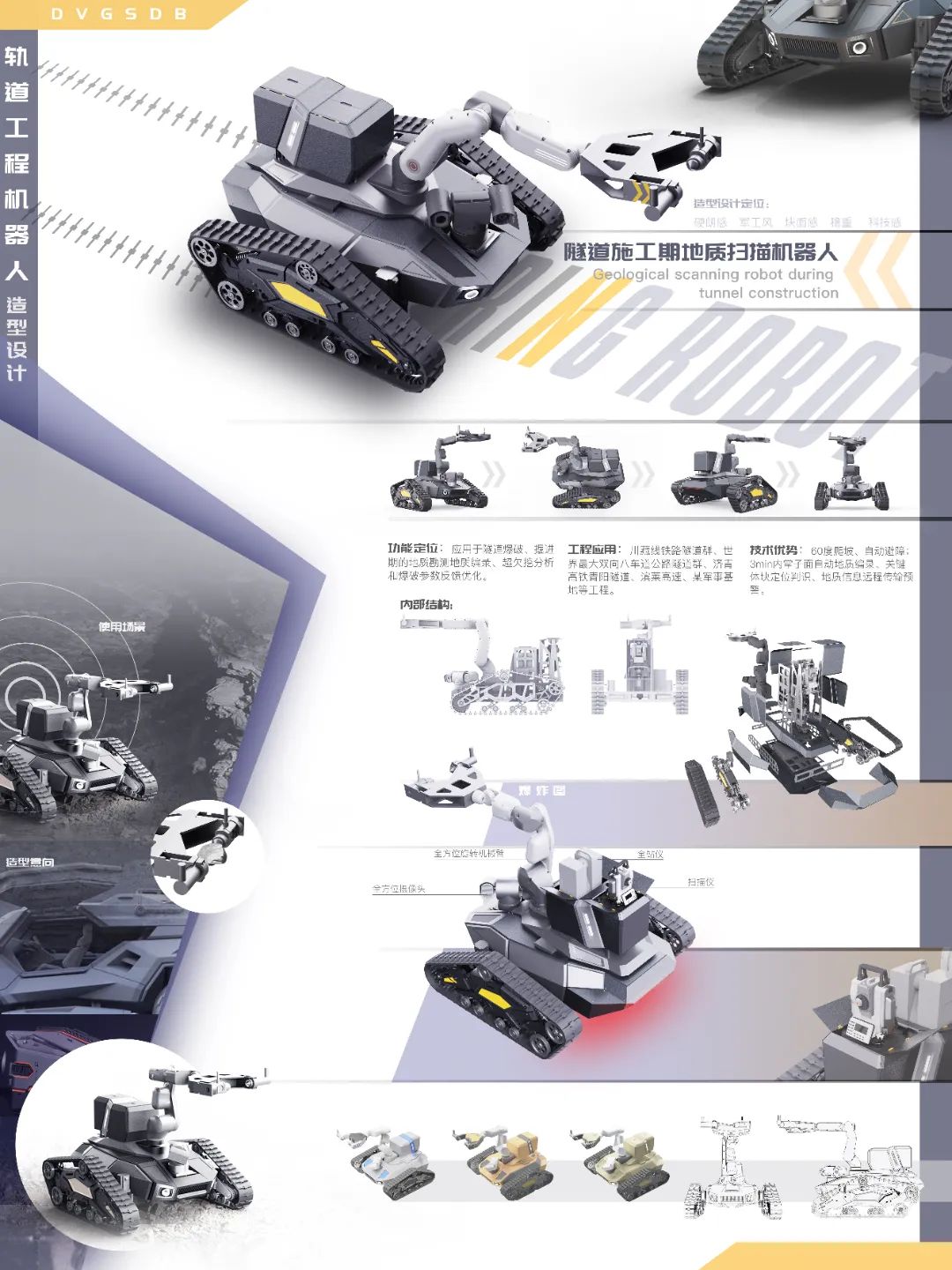 隧道施工期地质扫描机器人应用于轨道工程建设的地质检测工作,此次项目对其进行全方位的分析,在原始结构的基础上进行合理的造型设计,通过造型设计使其外观更具美感、科技感,符合功能、结构的需求,适应轨道交通建设复杂的工作环境。