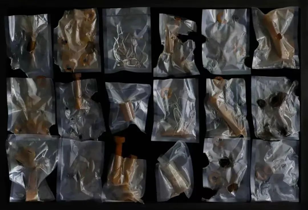 作品采用保鲜膜包裹代表着工业文明的已经生锈的铁制零件,这些零件在现代保鲜技术下得以保存。作品以黑色绒布为背景,透明保鲜袋充当画面中白色角色,整齐排列于画面中。作品中黑白灰各司其职,无色彩系构成了整幅作品。工业时代成就了当今的世界,工业时代给我们的社会带来了巨大的进步和发展的同时,我们也要注意事物的背面,已经“锈”住的文明是否还需要我们继续“保鲜”维持和歌颂?这值得我们深思。