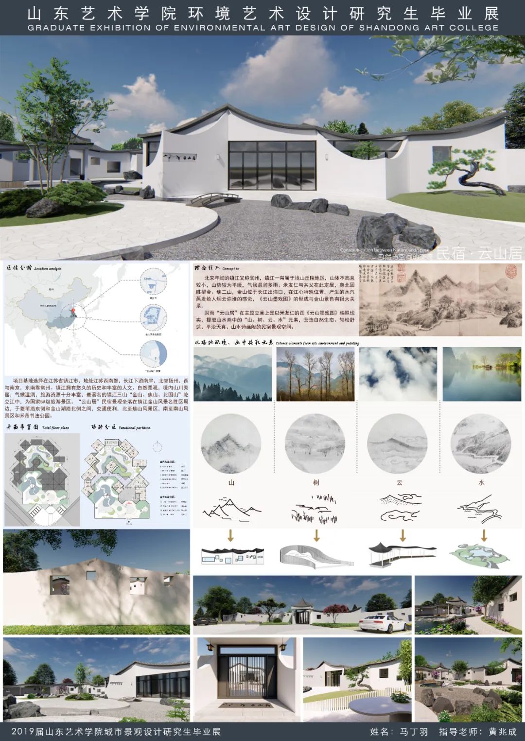 北宋年间的镇江又称润州,镇江一带属于浅山丘陵地区,山体不高且较小,山势较为平缓,气候温润多雨。米友仁与其父在此定居,登北固眺望金、焦二山。金山在江心这个特殊位置,产生的水汽蒸发给人烟云弥漫的感觉,《云山墨戏图》的形成与金山景色有很大关系。因而“云山居”在主题立意上是以米友仁的画《云山墨戏图》映照现实,提取山水画中的“山、树、云、水”元素,营造自然生态、轻松舒适、平淡天真、山水诗画般的民宿景观空间。