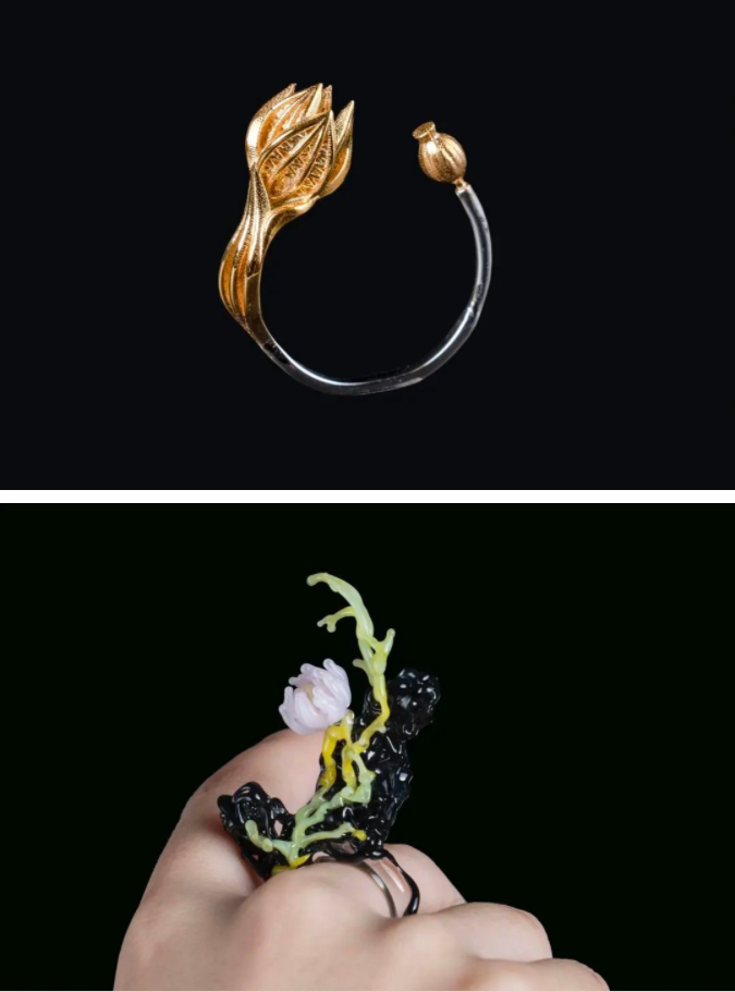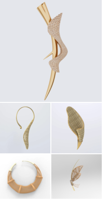 本作品采用柳条等材质进行设计创作,所制作的首饰作品分别呈现出了“化茧成蝶”的几个形态:幼虫觅食的形态、由虫化蛹的形态、虫蛹生长时期的形态以及化茧成蝶的形态。用柳条这种的材质进行制作,可以很好的表现出首饰作品所承载的温度,同时也对环保理念下的首饰概念进行了探究,并把柳编工艺带入到新的设计领域,展现出编织艺术的结构特点。