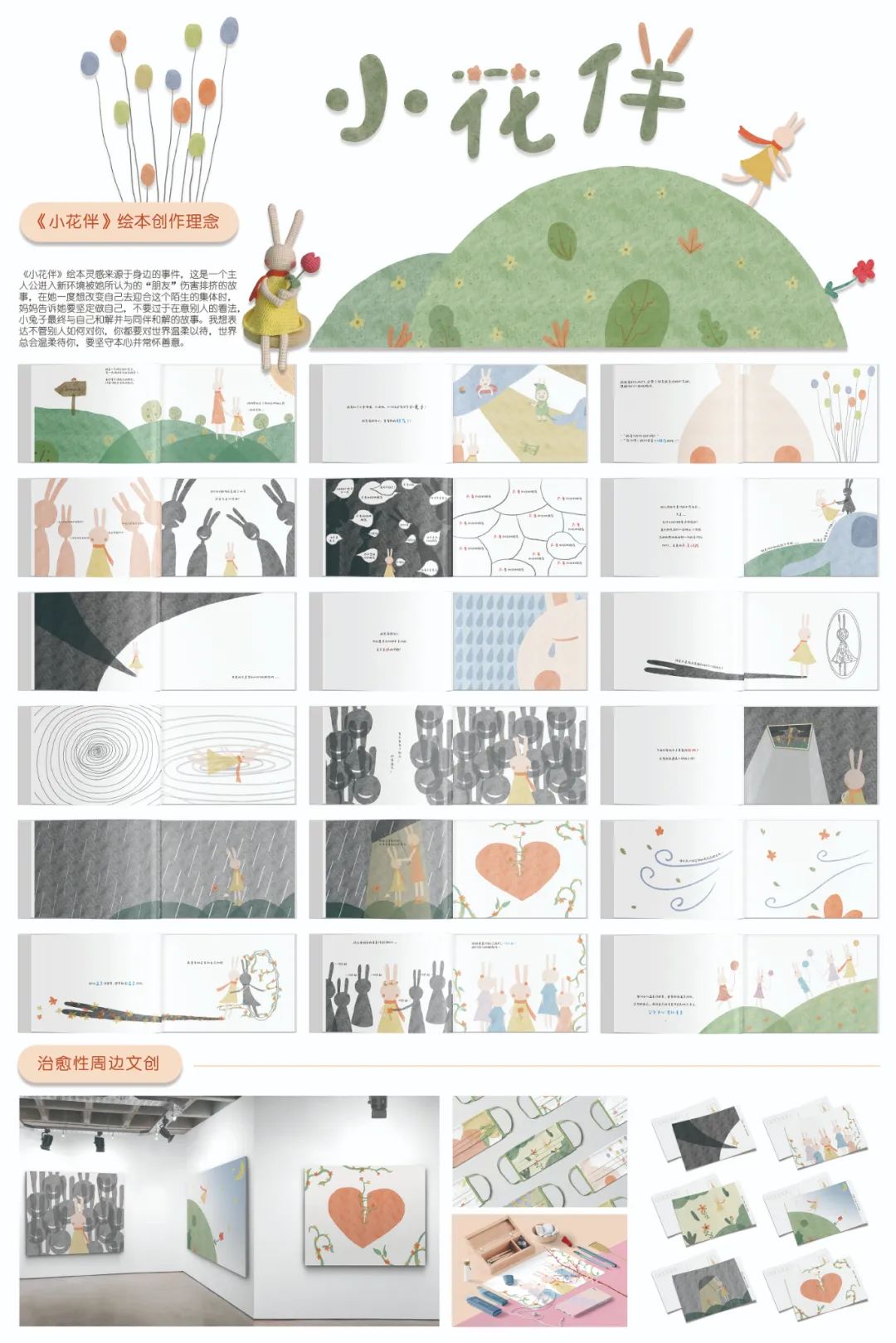 《小花伴》绘本灵感来源于身边的事件,这是一个主人公进入新环境被她所认为的“朋友”伤害排挤的故事,在她一度想改变自己去迎合这个陌生的集体时,妈妈告诉她要坚定做自己,不要过于在意别人的看法,小兔子最终与自己和解并与同伴和解的故事。我想表达不管别人如何对你,你都要对世界温柔以待,世界总会温柔待你,要坚守本心并常怀善意。