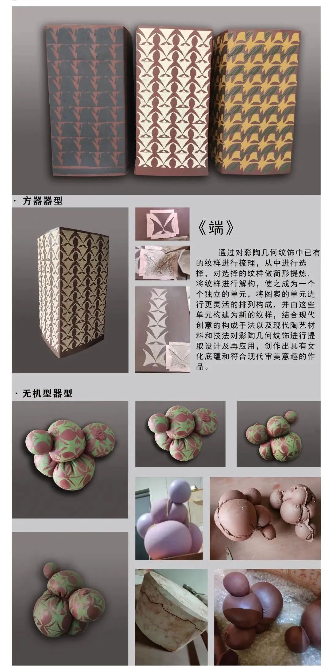 通过对彩陶几何纹饰中已有的纹样进行梳理,从中进行选择,对选择的纹样做简形提炼、解构和重组为新的单元形,并由这些单元构建为新的纹样,结合现代创意的构成手法以及现代陶艺材料和技法对彩陶几何纹饰进行提取设计及再应用。