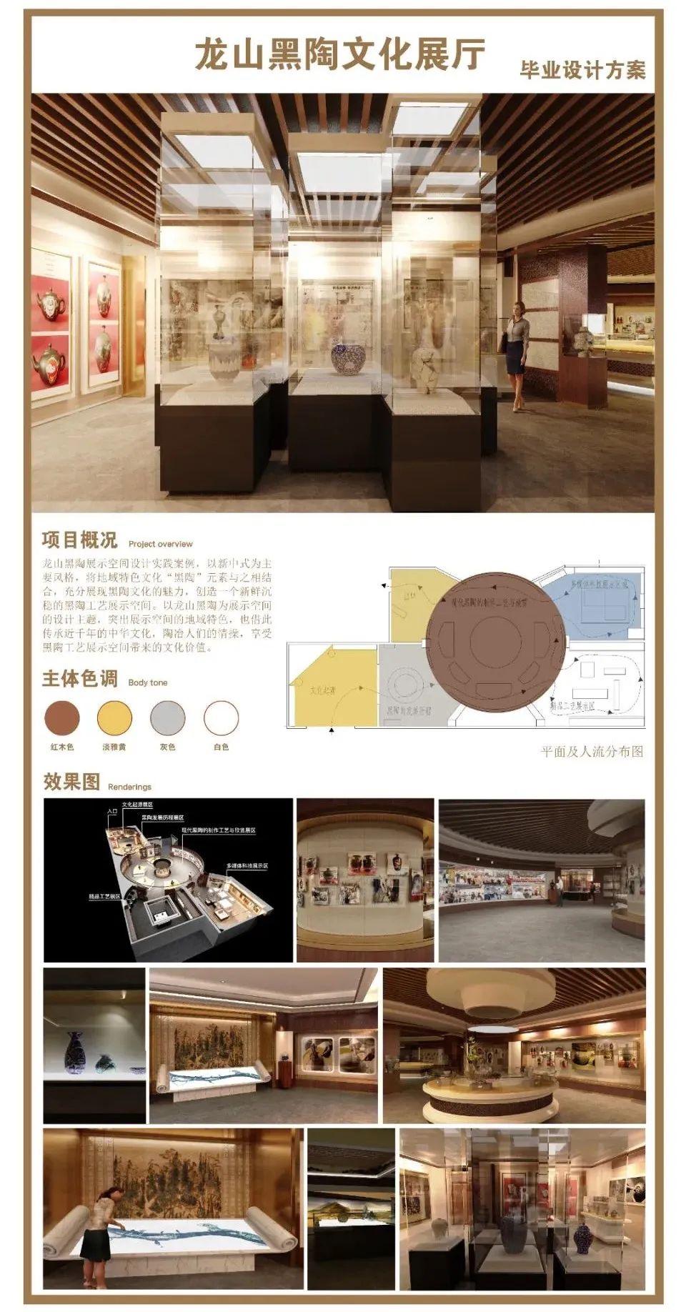 龙山黑陶展示空间设计实践案例,以新中式为主要风格,将地域特色文化“黑陶”元素与之相结合,充分展现黑陶文化的魅力,创造一个新鲜沉稳的黑陶工艺展示空间。以龙山黑陶为展示空间的设计主题,突出展示空间的地域特色,也借此传承近千年的中华文化,陶冶人们的情操,享受黑陶工艺展示空间带来的文化价值。