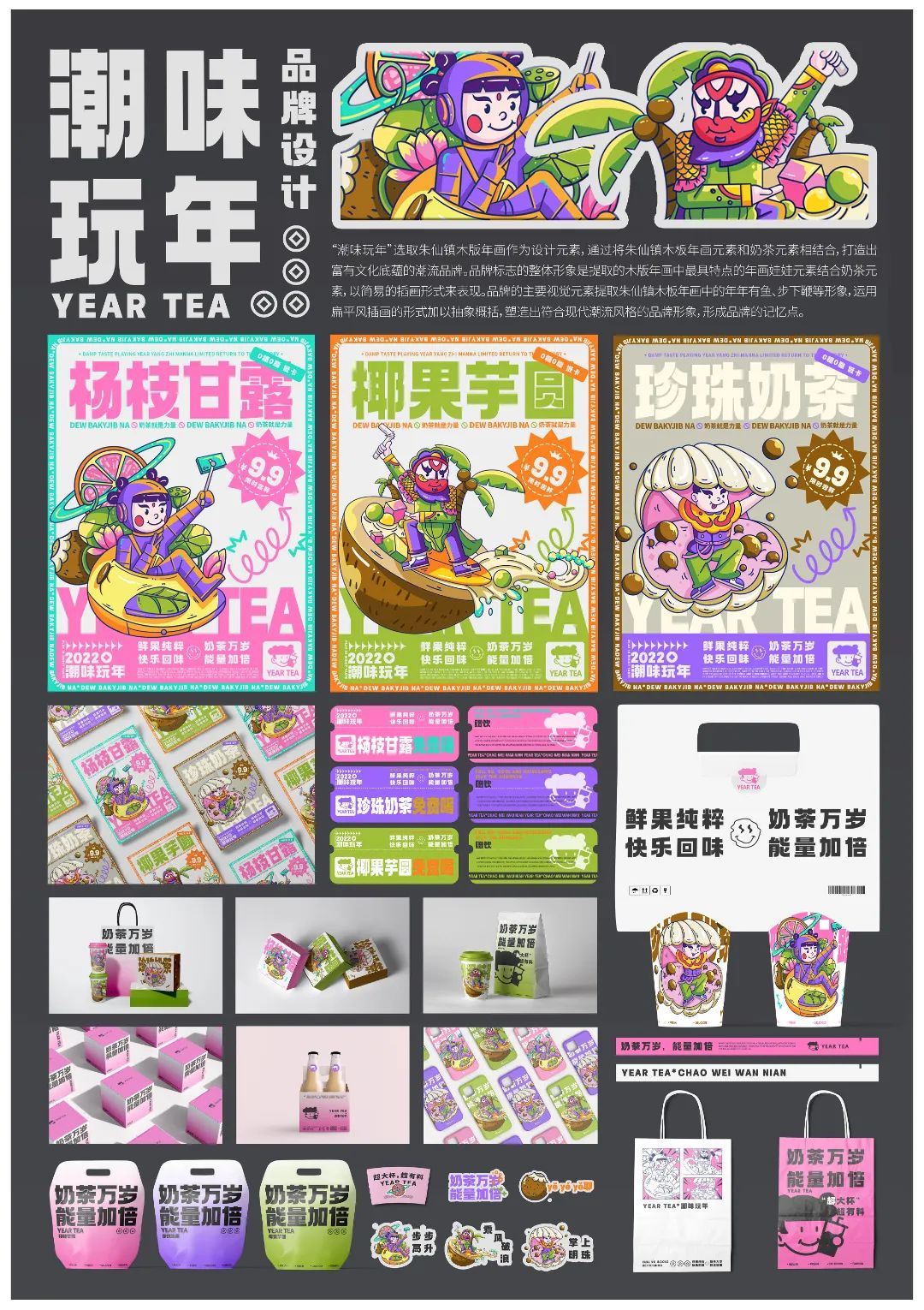 本作品选取朱仙镇木版年画作为设计元素,通过将年画元素和奶茶元素相结合,打造出富有文化底蕴的潮流品牌。品牌的主要视觉元素提取朱仙镇木版年画中的年年有余、步下鞭等形象,运用扁平风插画的形式加以抽象概括,塑造出符合现代潮流风格的品牌形象,形成品牌的记忆点。