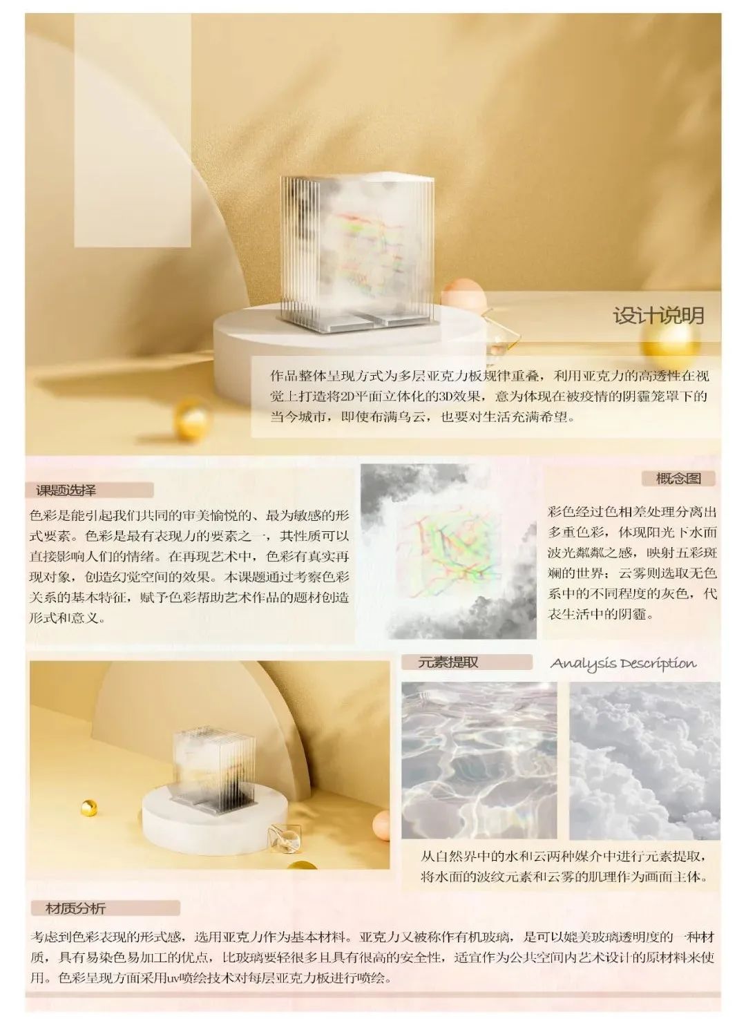 作品整体呈现方式为多层亚克力板规律重叠,利用亚克力的高透性在视觉上打造将2D平面立体化的3D效果。彩色经过色相差处理分离出多重色彩,以体现阳光下水面波光粼粼之感,映射五彩斑斓的世界;云雾则选取无色系中的不同程度的灰色,代表生活中的阴霾,意为体现在被疫情的阴霾笼罩下的当今城市,即使布满乌云,也要对生活充满希望。
