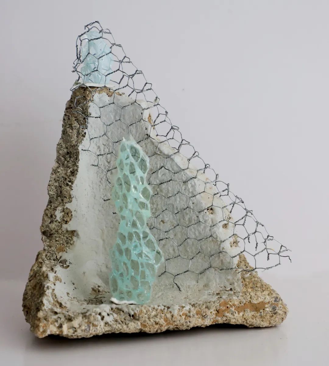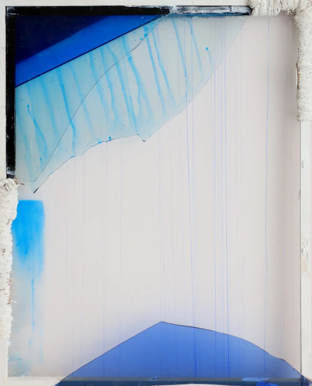 使用半块破碎的玻璃夹板作为主体,使用草绳捆绑于边框上,通过玻璃钳子塑造成冰川的剪影,在夹板内加入调制的滴胶,模仿冰川融化留下的痕迹。在玻璃夹板斜下方选出一块三角形蓝色玻璃沾粘,于上方的仿制冰川造型玻璃形成呼应,并在边缘处增加滴胶装饰,增强流水感。边框背部系上有粗细疏密变化的蓝色鱼线,最后对作品边框进行刷白。这个作品意在表达冰川融化的这一环境问题,希望以这件作品可以让人们意识到环境?;た滩蝗莼?。