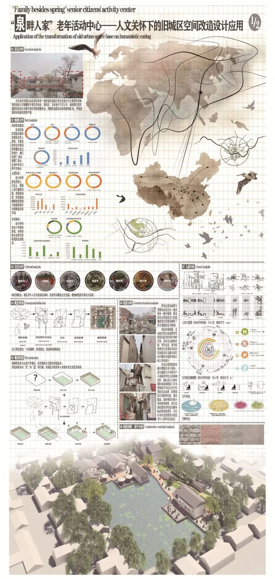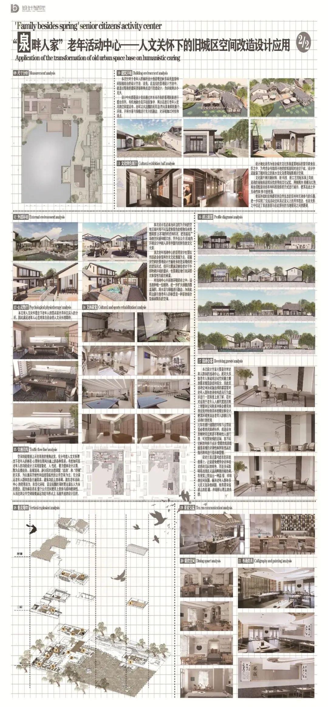 “泉畔人家”老年活动中心设计案例选取自“家家泉水,户户垂柳”的古文化街区,设计理念取自“大明湖畔,趵突泉边,故居在垂柳深处”,通过“潺潺泉水、韵律之美”的地域元素,用“清泉石上流”的形式,尽显“曲水芙蓉”的泉水形态之美,在满足老年人群体对生理和心理两方面上的需求同时,秉承着在合理保留和利用改造原有历史遗留的基础上,扎根于深厚的文化底蕴,使地域性的文化传承历久弥新,尽显人文之关怀。
