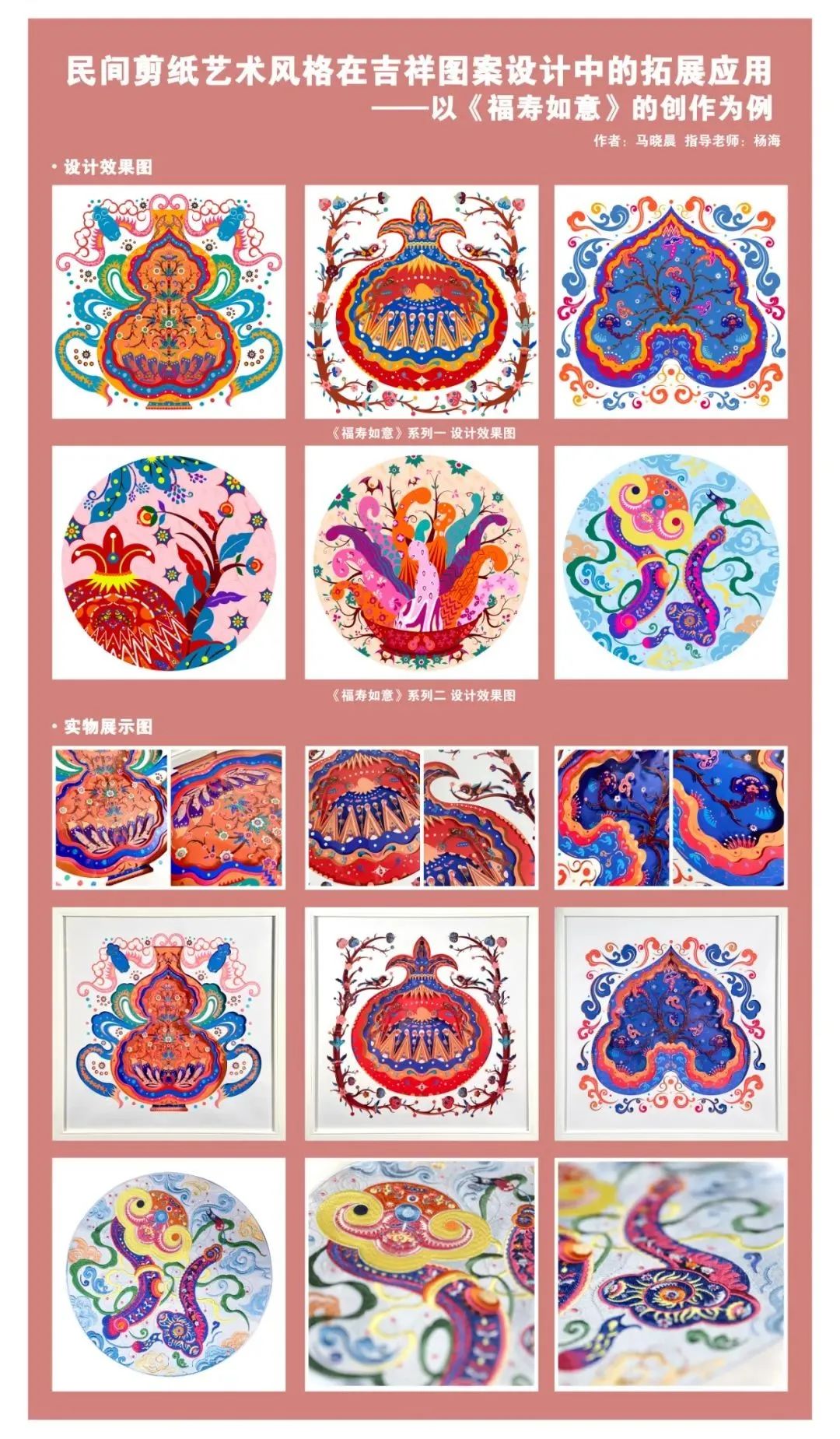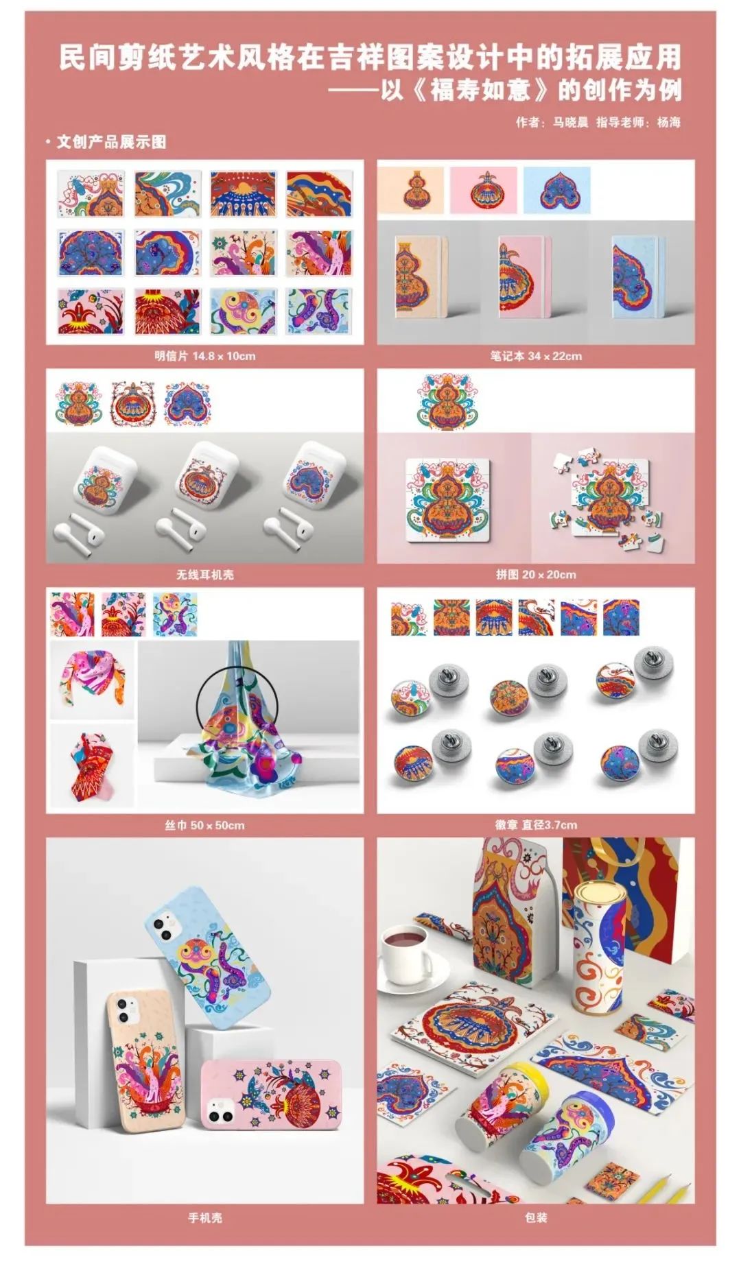本设计作品分为两个系列,每个系列分为“福、寿、如意”三个主题。作者从吉祥图案的再设计和作品的呈现形式两方面切入,吉祥图案的再设计打破了以往简单搬运经典纹样的模式,通过对吉祥图案造型特点与表现手法的分析将图案进行创新。在此基础上再结合民间剪纸艺术风格的特点对图案进一步完善,最终设计出符合现代审美的吉祥图案。呈现方式上选择手推绣工艺刺绣、彩色多层立体纸雕以及现代文创产品这三种较为“年轻”的呈现方式来进行作品的展示,实现“传统”图案与现代技术的碰撞。