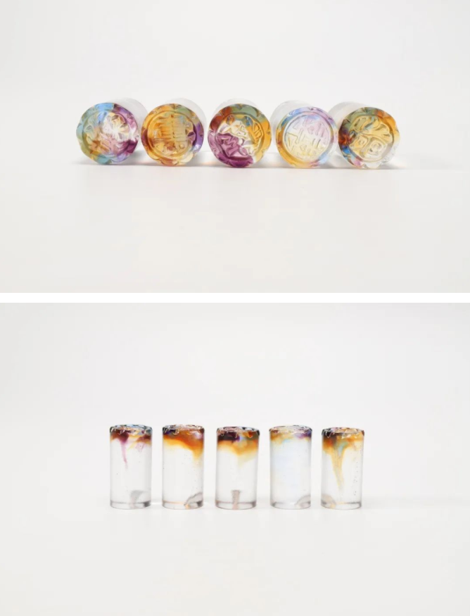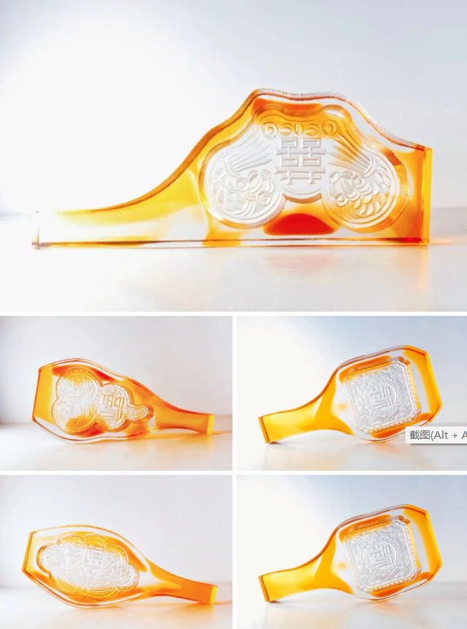 《琉光溢彩》旨在呼吁当代设计者关注传统文化,赋予传统文化新的活力,赋予非物质文化遗产新的生命力,创作具有人文、历史、情感内涵的温度作品。古往今来的大多数榼子都使用木质材料进行雕刻,这早已成为人们心中约定俗成的规则,木质的材料使榼子呈现厚重古朴的气质。本次创作中,使用新材料古法琉璃替代传统的木质雕刻,带来打破传统的感官冲击。在采用新的创作题材去展现同一种材料不同的呈现方式时,也赋予了被表达物品新的生命力,所产生的作品是源于二者相互包容的产物?!读鞴庖绮省废盗写撤且旁俅醋髯髌烦氏殖鼍钙媲?、流线飘逸、斑斓剔透的视觉效果。