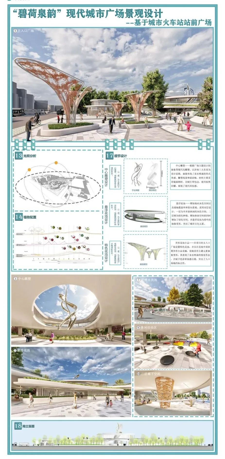 该项目以济南的泉水为对象,抽象提取出“泉”元素;从“四面荷花三面柳,一城山色半城湖”的美誉中抽象提取出“荷”元素,最终确定主题为“碧荷泉韵”。场地内运用大量的曲线和异形种植区,抽象表现城市文化元素“泉”水流动和“荷”叶漂浮之感。项目设计分为两层,一层空间主要用于日常通行、娱乐、基础休闲,二层空间主要用于眺望观景、增加活动区域和景观视角。通过济南的城市特色文化元素对该广场进行整体的景观设计提升,打造设计主题突出、设计体验超前、设施特色浓厚、功能划分合理、文化底蕴丰富的城市印象现代文化景观广场,展现城市文化,保证通行和休憩功能,提高游人体验感并满足周边居民的日常需求。