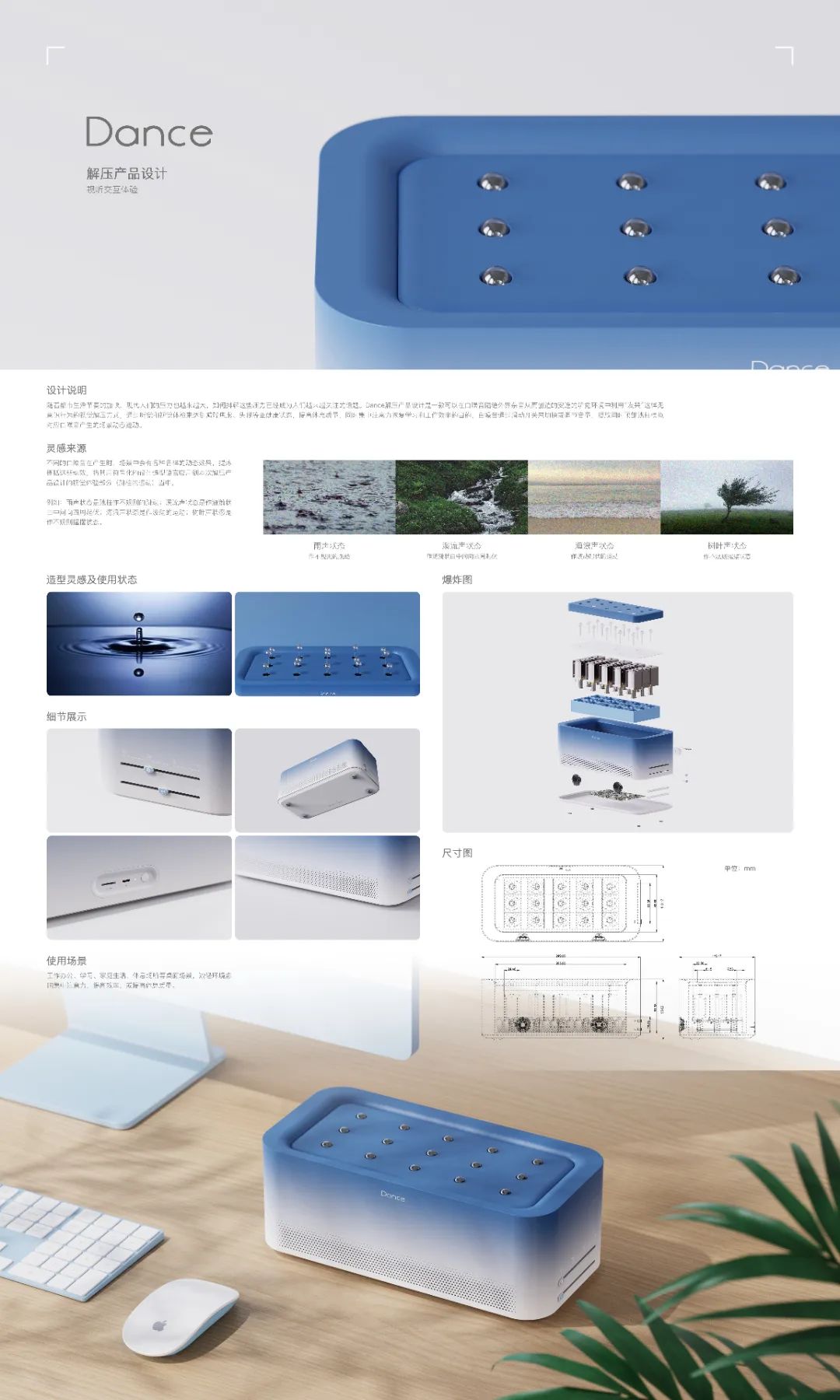 随着生活节奏的加快,现代人们的压力也越来越大,如何排解这些压力已经成为人们越来越关注的话题?!癉ance”通过给人的视听体验,缓解身心压力,减轻焦虑、失眠等亚健康状态,提高休息质量,同时使人们集中注意力恢复学习和工作效率。为解压产品提出了创新的解压使用方式和概念。