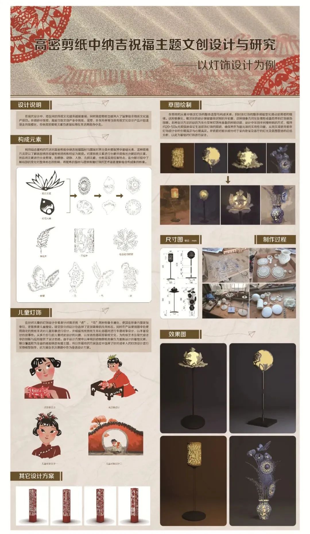 本课题对高密剪纸中纳吉祝福主题的文创设计与应用作为研究主题。在分析高密剪纸中纳吉祝福主题的基础上,对灯饰设计中传统装饰的种类、色彩的应用、材料搭配、艺术效果及文化内涵等进行了总结提炼,并按照灯饰照明用途、散光方式、布局方式的应用现状进行了研究,总结出现代装饰照明的设计特点及应用方法。