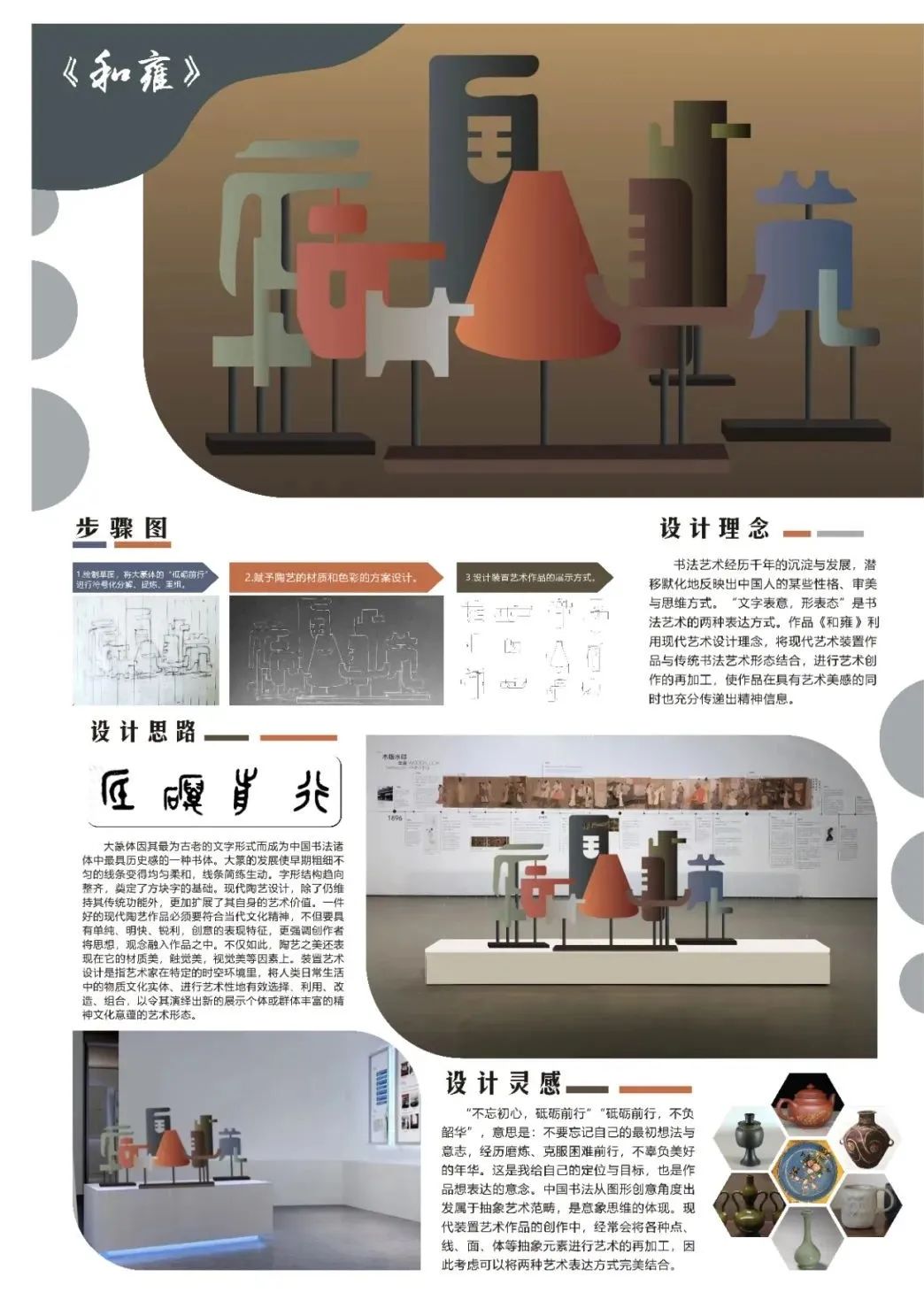 书法艺术经历千年的沉淀与发展,潜移默化地反映出中国人的某些性格、审美与思维方式?!拔淖直硪?,图形表态”是书法艺术的两种表达方式。作品《和雍》利用现代艺术设计理念,将现代艺术装置作品与传统书法艺术形态结合,进行艺术创作的再加工,使作品在具有艺术美感的同时也充分传递出精神信息。